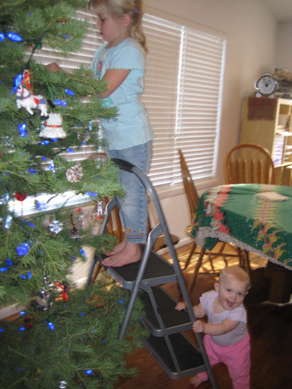 Eloise was thrilled to help Grandma and Grandpa decorate their tree. She liked deciding where things should go. There was a large angel section, and a bird section with pillow for the bird (some of Grandma's handwoven oranments), food (a cookie ornament) and light (a star ornament). |