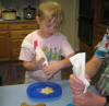 Eloise is becoming more patient with her frosting. She enjoys using the decorating bags. However, by the time she is finsihed, the cookie will be pretty thickly covered. It's more application than final result that she enjoys. |