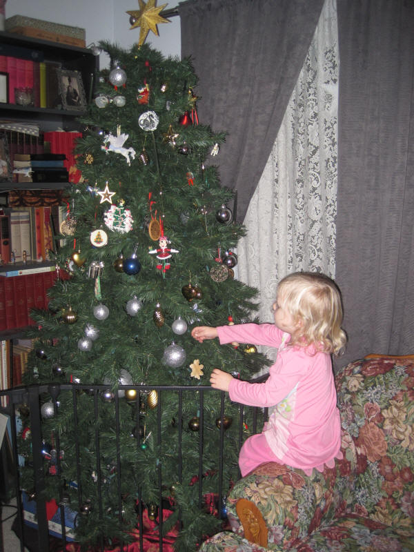 Every time she was in the front yard, Abby went down the line of our snowflake lights, touching each one. |