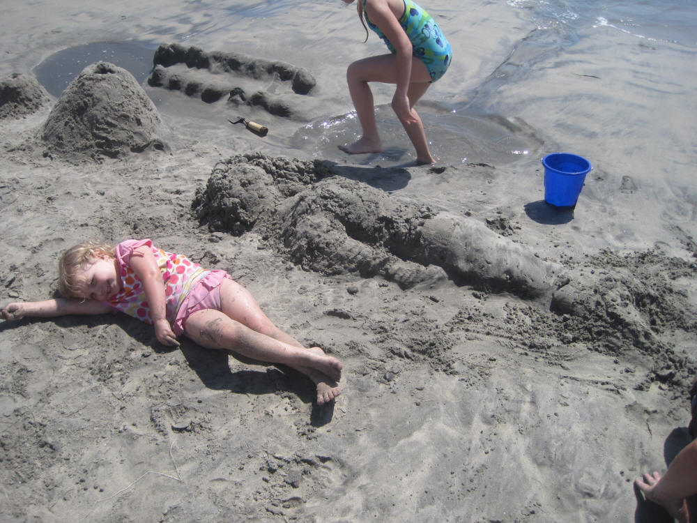 After a week of >105 deg F, we headed to the beach. We took a break from castles and tried a sand volcano. Eloise enjoyed collecting red seaweed to fill the caldera. |