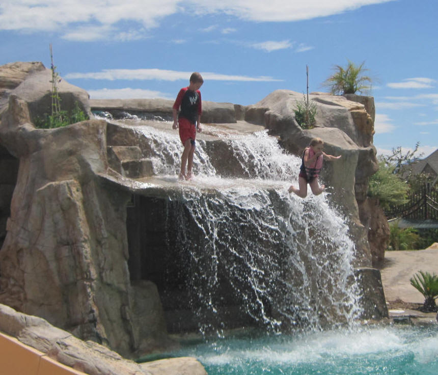 This year Eloise announced she was big enough to jump off the waterfall. Like the slide, she was soon taking care of it all by herself. |