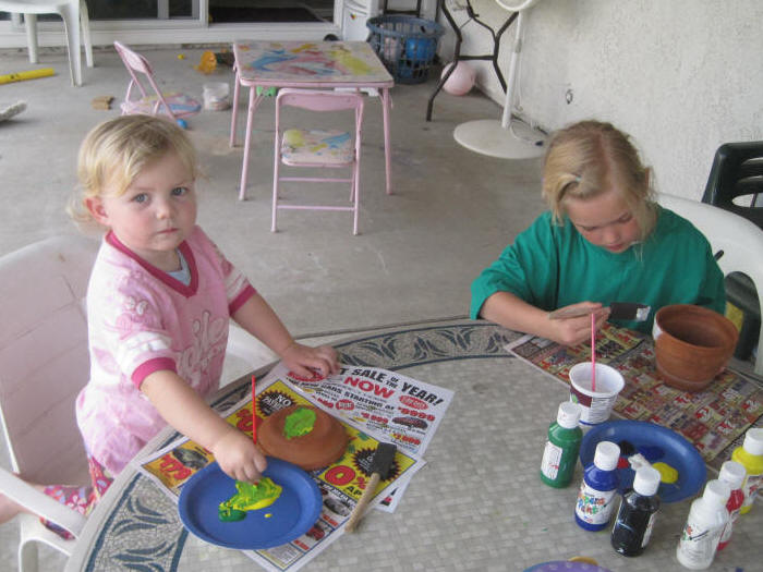 Eloise proposed painting some flower pots. Abby was thrilled to join in. |